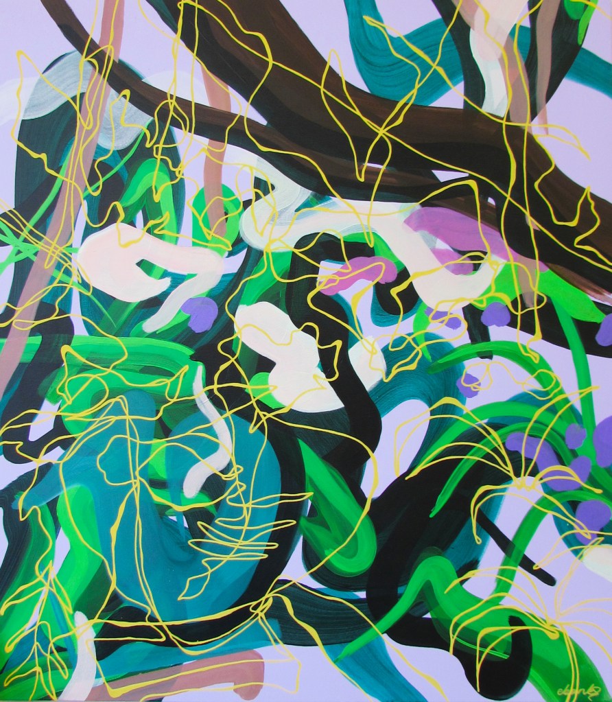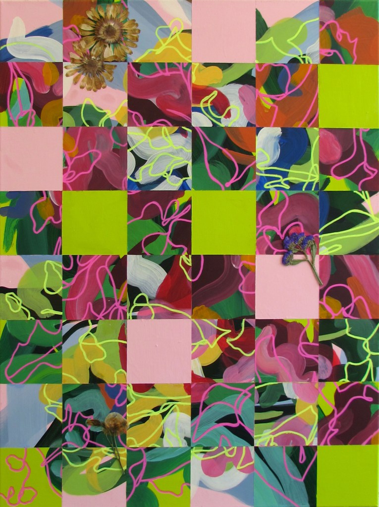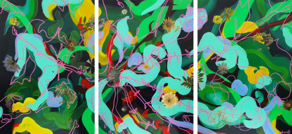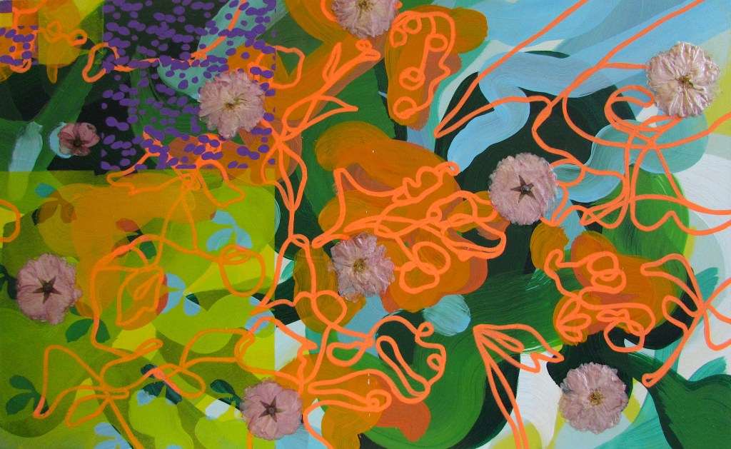 Shifting Terrain Posted byeviegbanks31st May 2022Posted inUncategorized ‘Untitled (Tweety Bird)’, 2022. Acrylic, spray paint and graphic pen on canvas. 88cm x 98cm. ‘Hepworth Garden’, 2022. Acrylic and graphic pen on canvas. 89cm x 101cm. ‘A Tribute to Love’, 2022. Acrylic, graphic pen and pressed flowers on canvas. 60cm x 80cm. ‘A Place Unknown’, 2021. Acrylic paint, graphic pen and pressed flowers on varnished MDF board. (3x) 42cm x 59cm. ‘Patterns in Nature Reimagined’, 2021. Acrylic, graphic pen and pressed flowers on MDF. 34cm x 55cm. Related