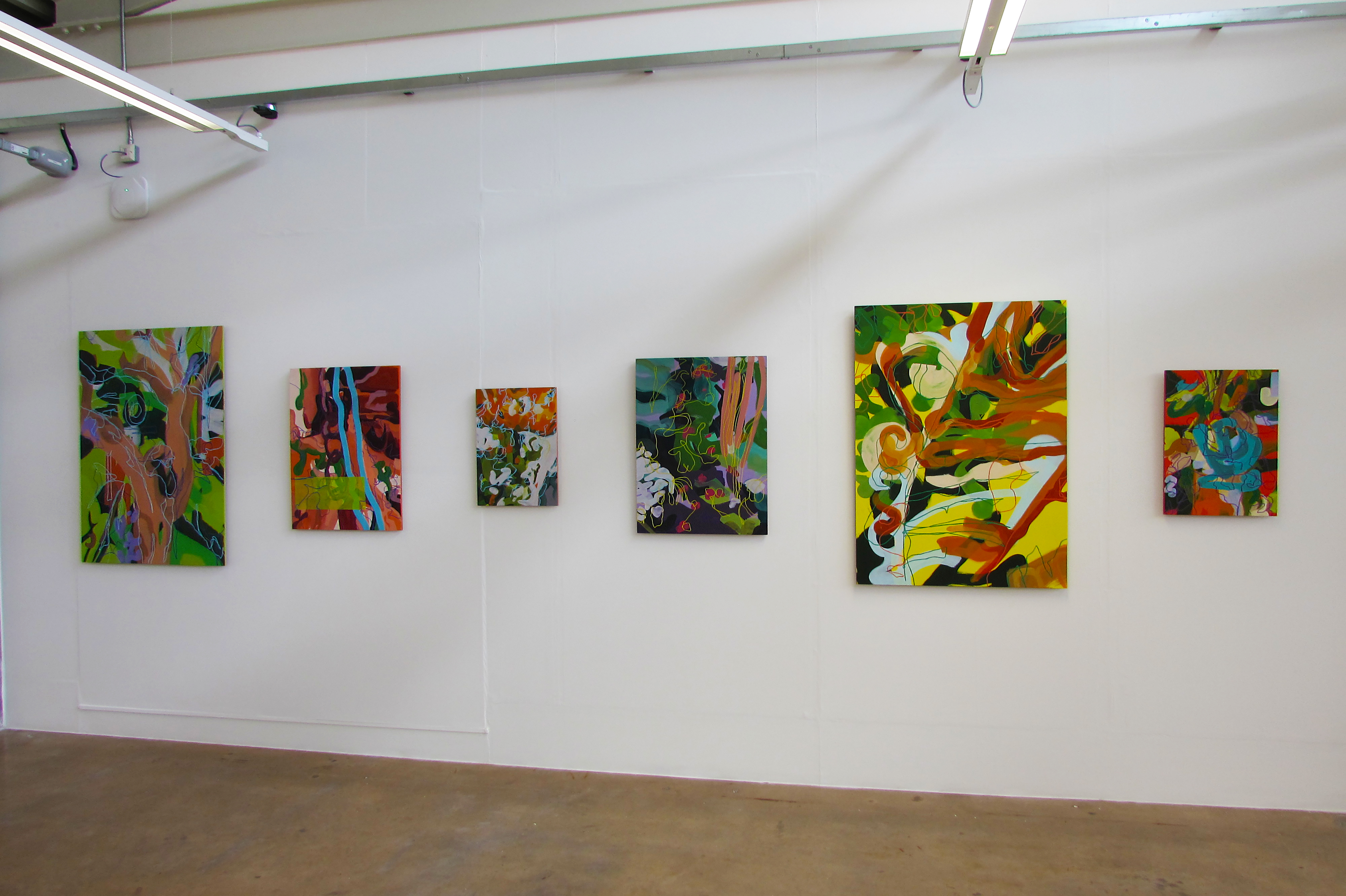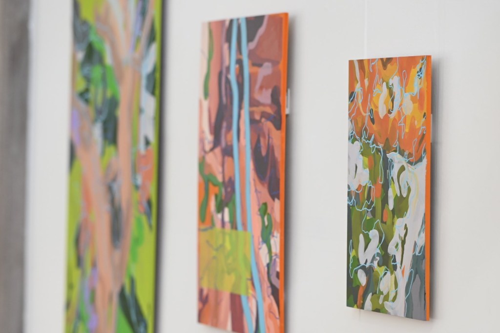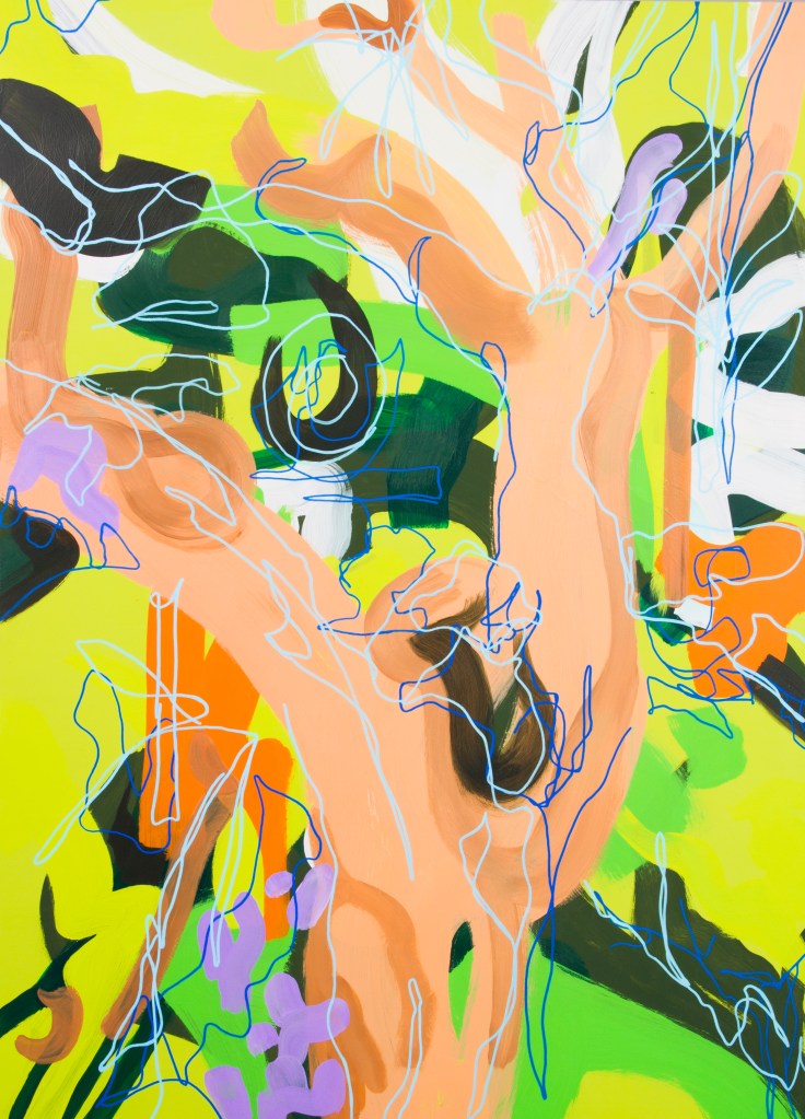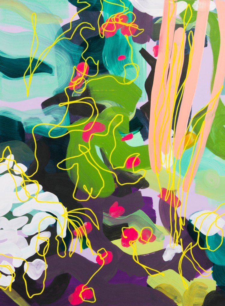 My process is intuitive, working instinctively with no preconceived notion of the end image. I begin by layering brush marks, building up the surface until the combination of gestures successfully translates these embodied experiences. I then introduce graphic line, and occasional colour blocks, as a way of breaking up the brush marks to create a pathway for visual exploration. With a basis in colour theory and aesthetics, I use colour in a playful manner as an extension of the landscape, with the aim of creating a visual energy and dynamic surface suggesting my relationship to the landscape of St. Ives