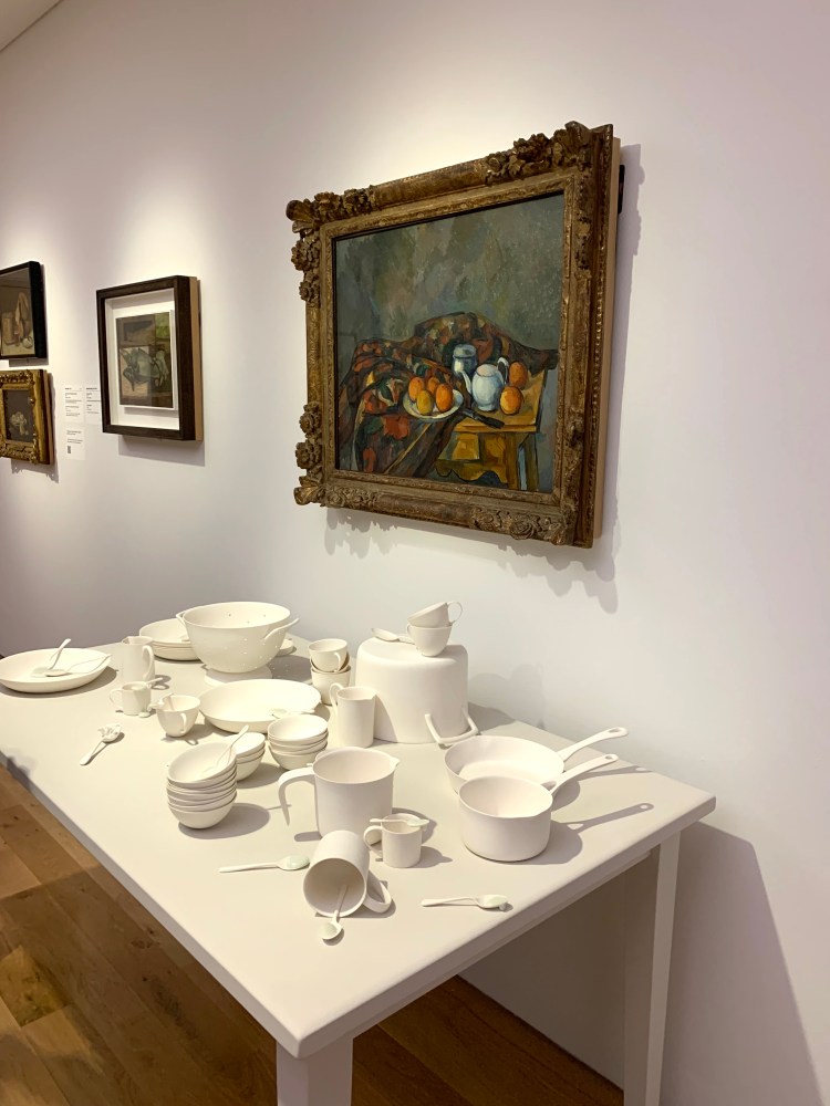 Coexistence is a common theme throughout the exhibition. The small space off to the side of the room dedicated to history initially feels fitting for still life in relation to the historical hierarchy. Upon closer inspection however the viewer is confronted with a space busy with artworks to argue the genre’s importance and to break this traditional understanding. The genre of still life played a role in the changing perception of the rules of art, undermining the academy’s hierarchy. Paintings by artists such as Gwen John reinforce this break in the hierarchy, as one of the first generations of female artists in Britain allowed formal training. The inclusion of her paintings marks the shift of perspective and breakdown of the rules that would lead to the generally equal playing field concerning genre in contemporary art, and the shift into the conceptual. In reference to the conceptual and allegorical meaning is the inclusion of an example of Dutch flower painting. The importance of this painting is fleeting in comparison to the sub-genre of Dutch flower paintings in whole, which had a role in undermining the hierarchy and shifting perceptions. The short-lived blossoming of the cut flowers symbolic of life and the wilting blooms acting as a sharp reminder to the abruptness of life and grim finality of death. This painting acts as a subtle acknowledgement to the sub-genre’s role in the shift of perspective.