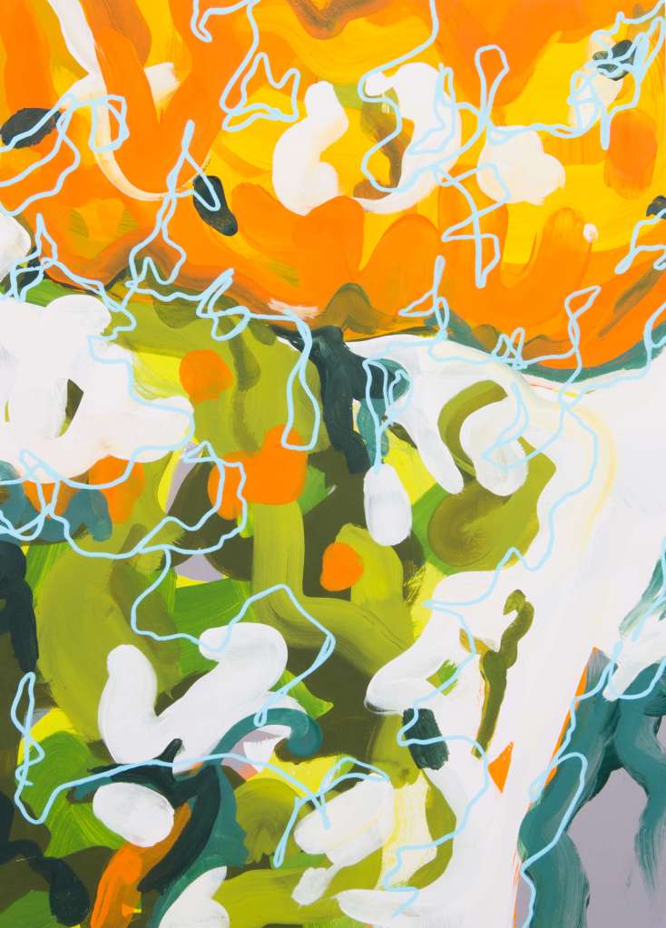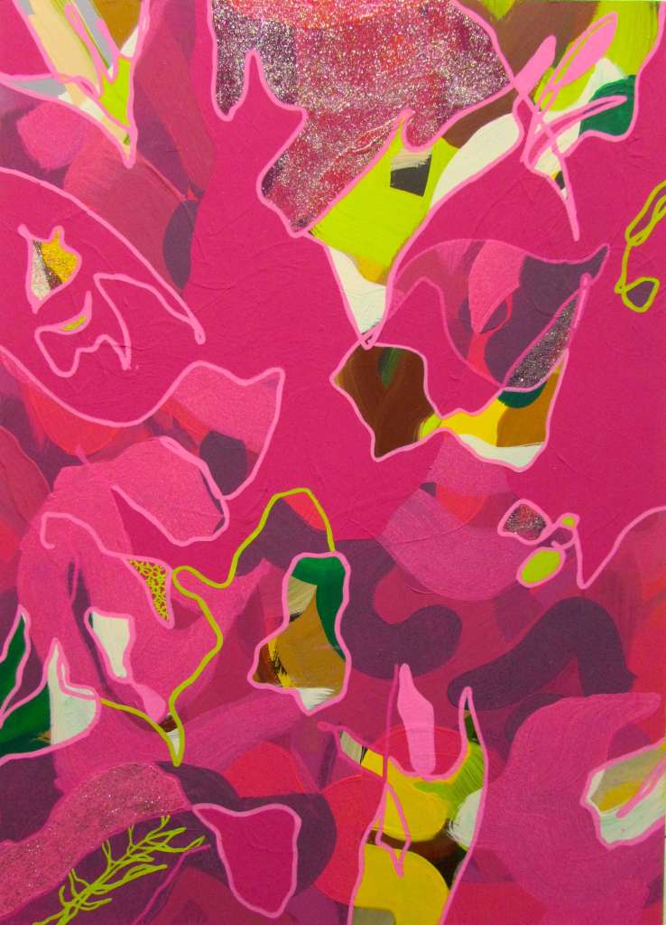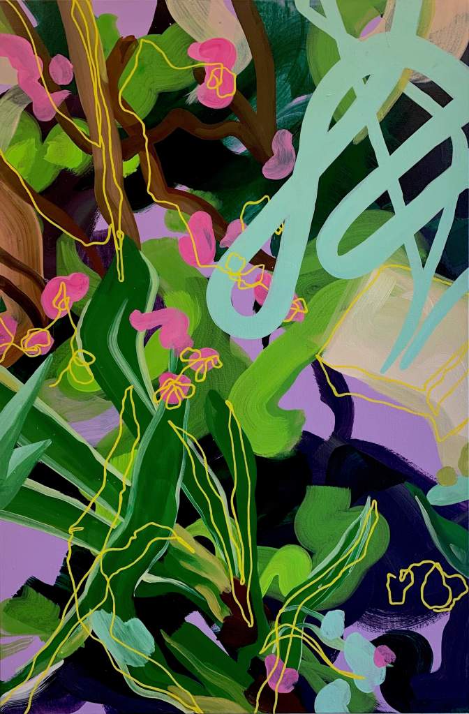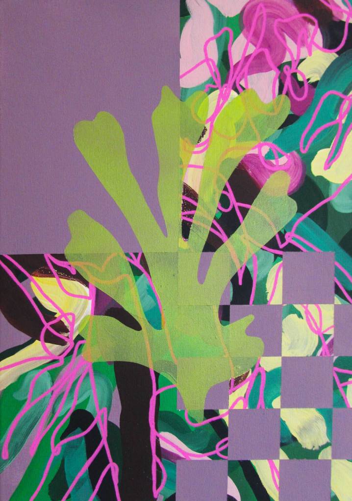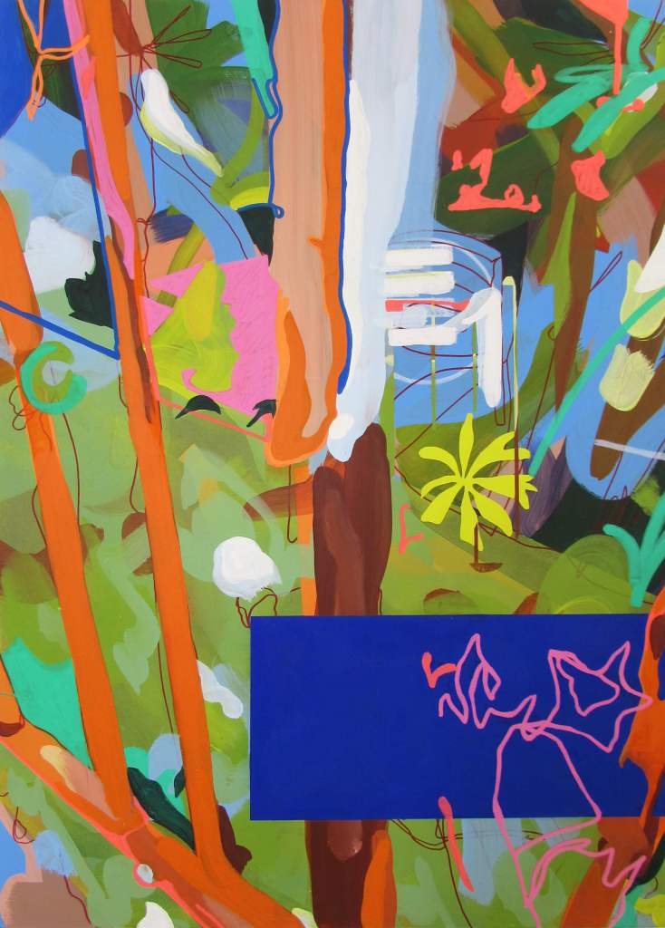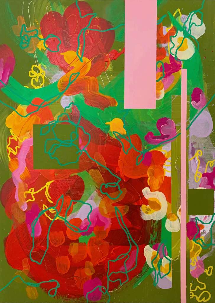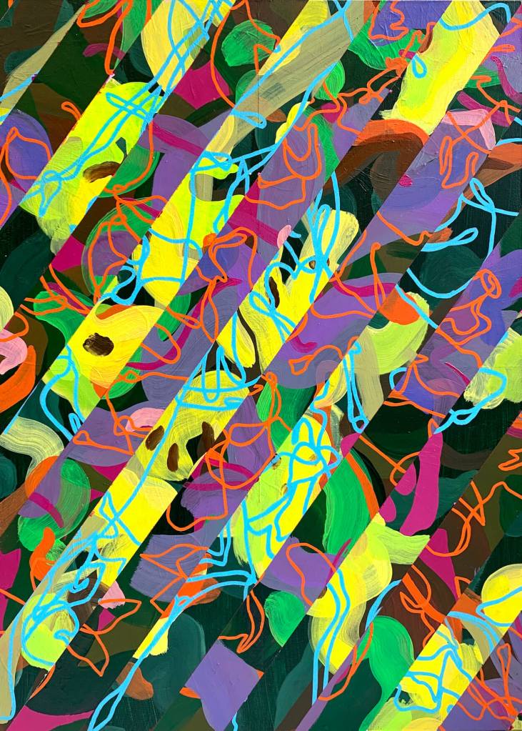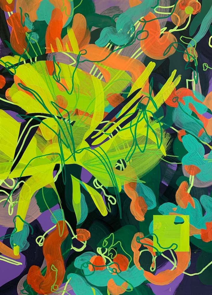 “The world depicted in Evie Banks’s neon-hued paintings engages all our modes of perception. It’s easy to forget you’re looking at a two-dimensional plane, as alien greens, ultramarine, and blossom-pinks clash and bang. The viewer is taken into a vortex-like realm of hyper-perception, augmented by Banks’s unique visual language and use of a variety of materials. Inspired by the town of St Ives in Cornwall, she aims to translate the botanic and landscapes into evocative and vibrant scenes. Her unique process depends on a continual building up of layers, combining gestural brush strokes, graphic lines, and block colour, with disarming results. Drawing references from phenomenology and colour theory, each piece is a whittled concentration of pure energy.” – New Blood Art.
