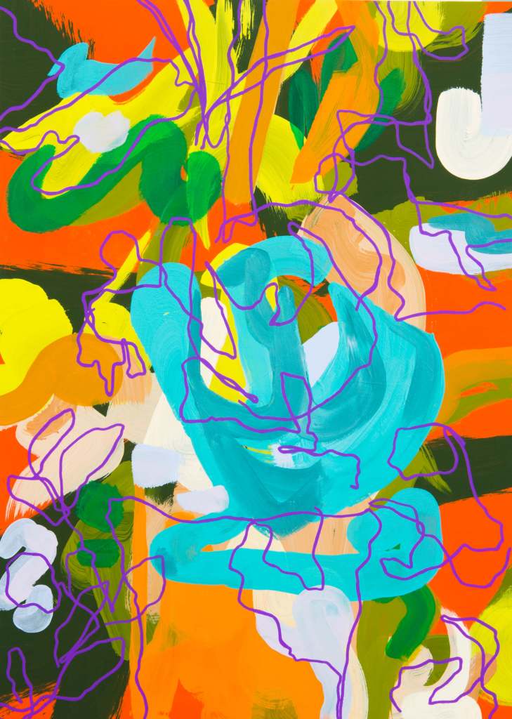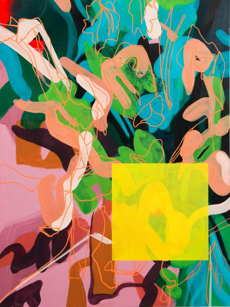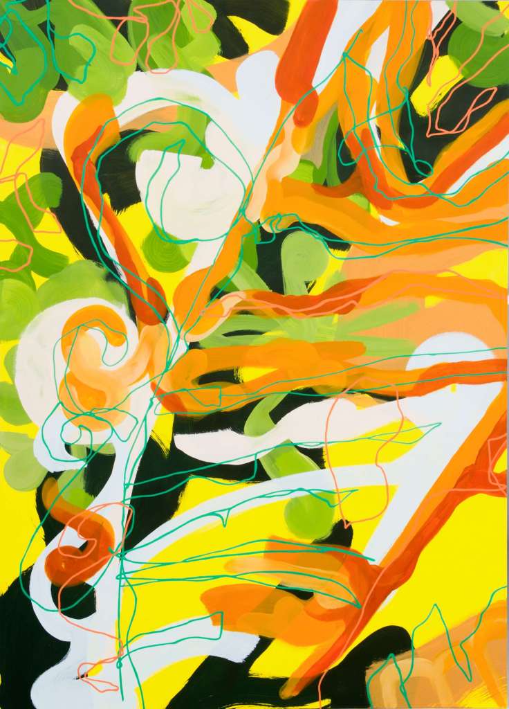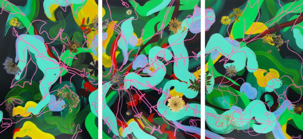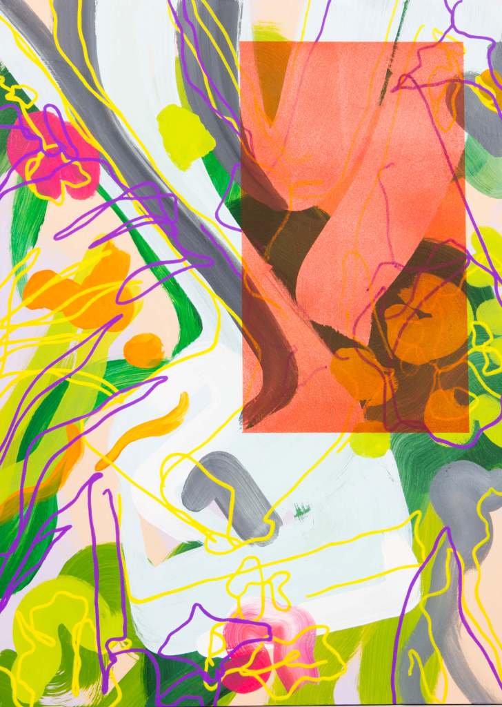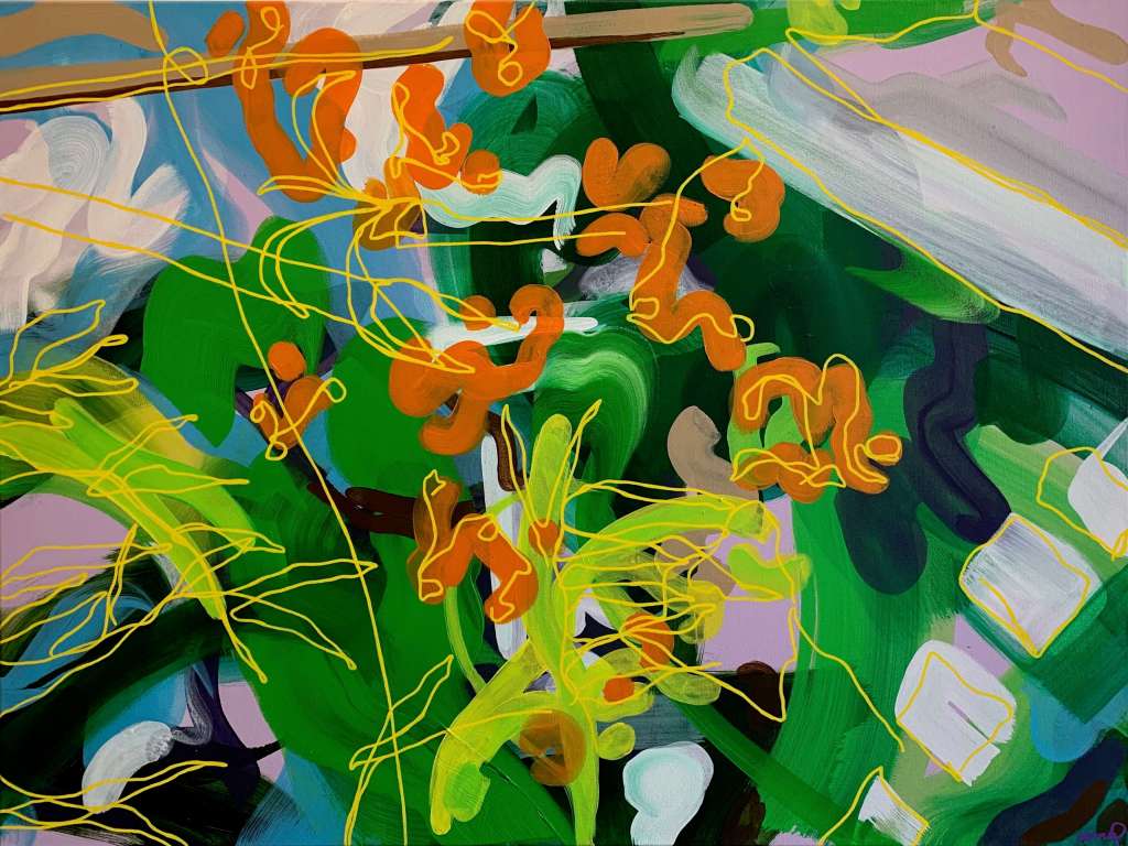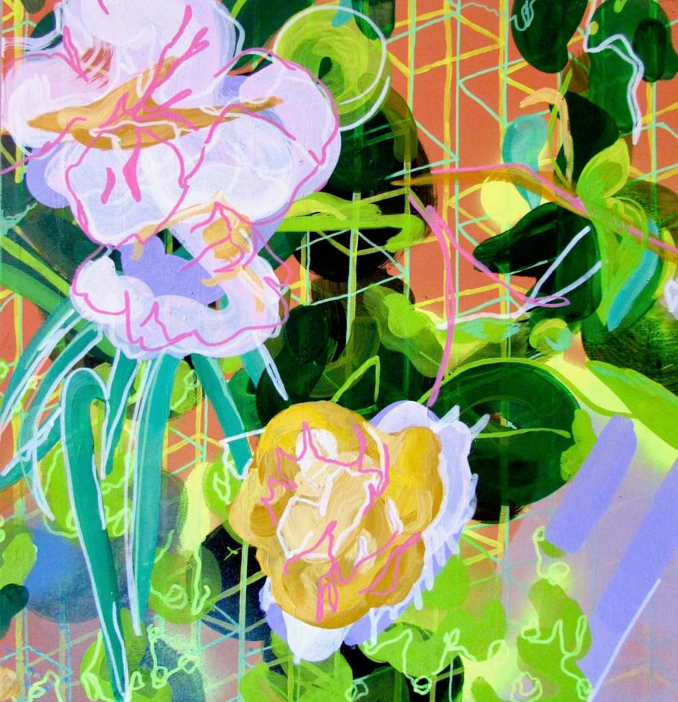 “The world depicted in Evie Banks’s neon-hued paintings engages all our modes of perception. It’s easy to forget you’re looking at a two-dimensional plane, as alien greens, ultramarine, and blossom-pinks clash and bang. The viewer is taken into a vortex-like realm of hyper-perception, augmented by Banks’s unique visual language and use of a variety of materials. Inspired by the town of St Ives in Cornwall, she aims to translate the botanic and landscapes into evocative and vibrant scenes. Her unique process depends on a continual building up of layers, combining gestural brush strokes, graphic lines, and block colour, with disarming results. Drawing references from phenomenology and colour theory, each piece is a whittled concentration of pure energy.” – New Blood Art.