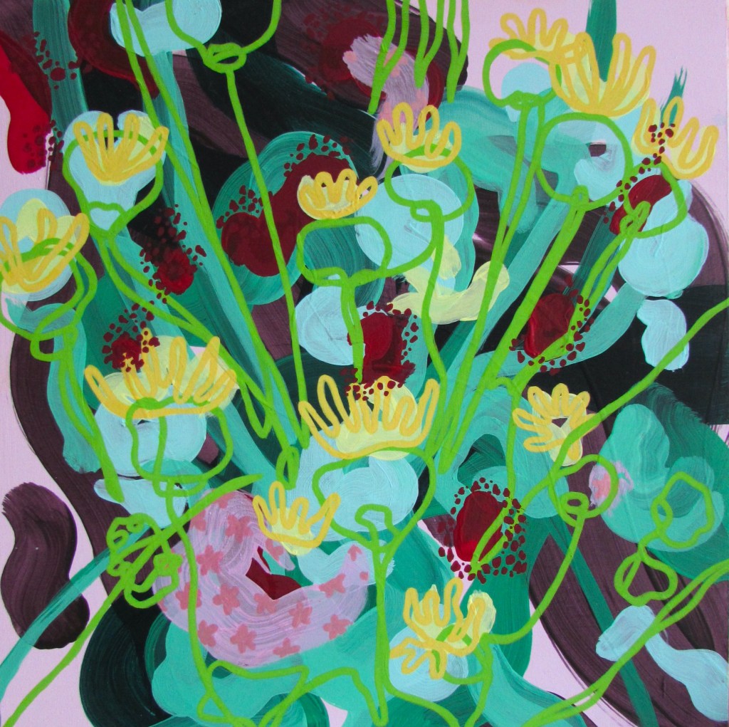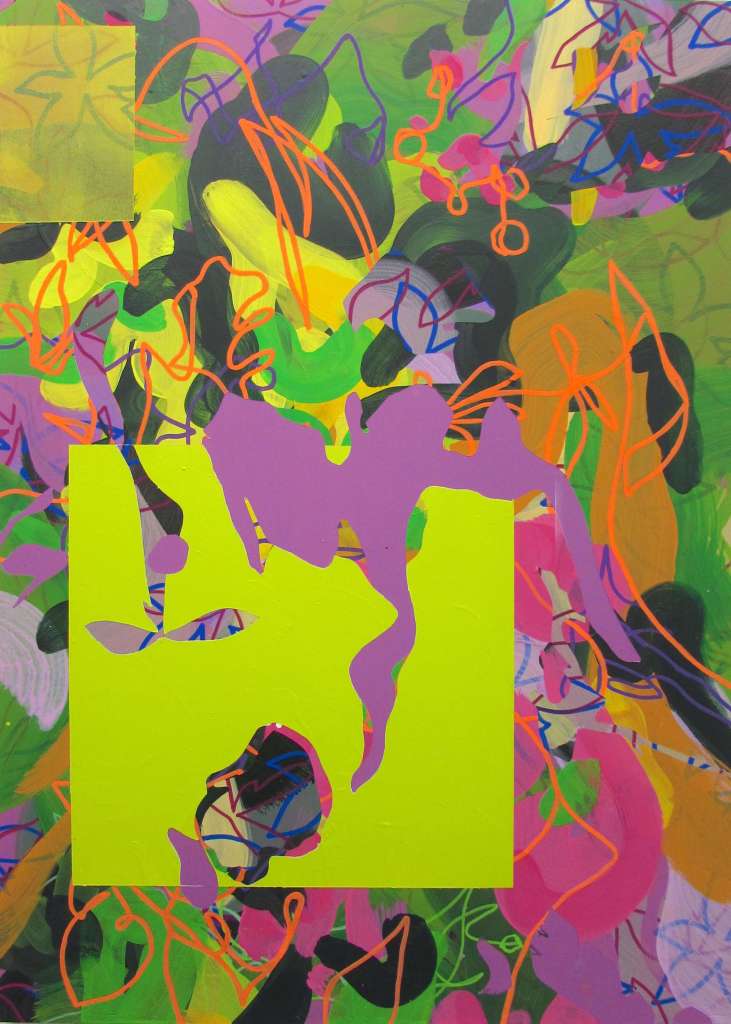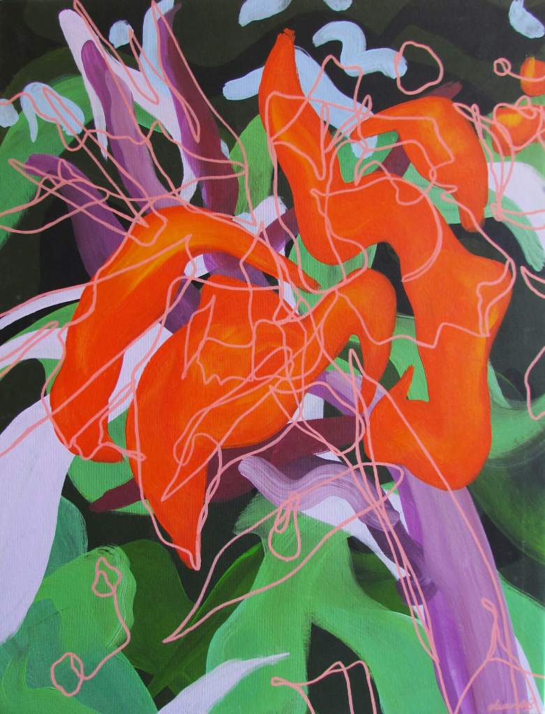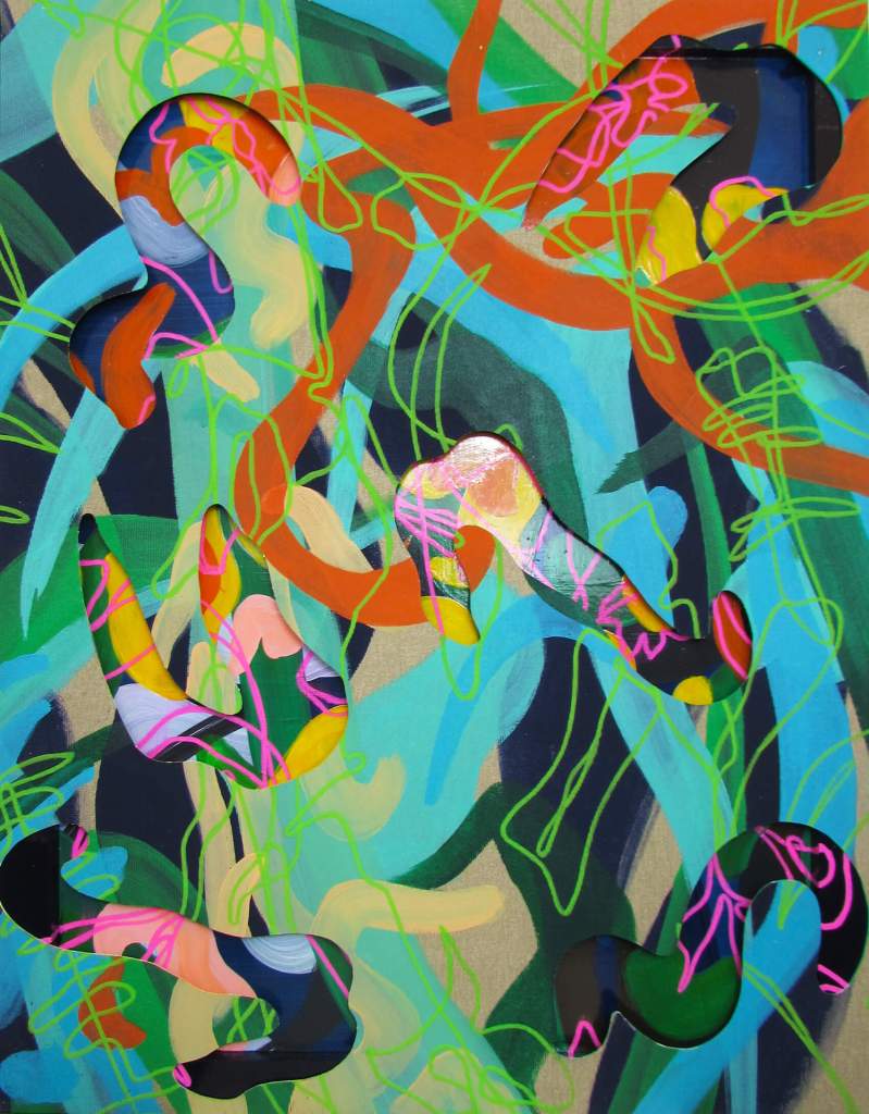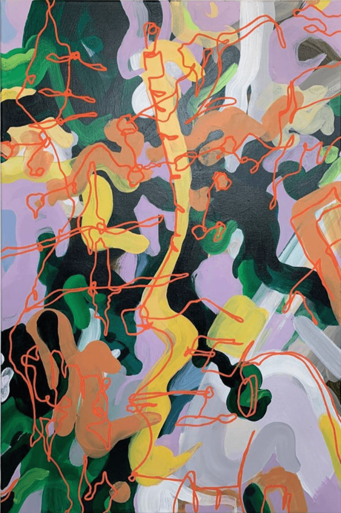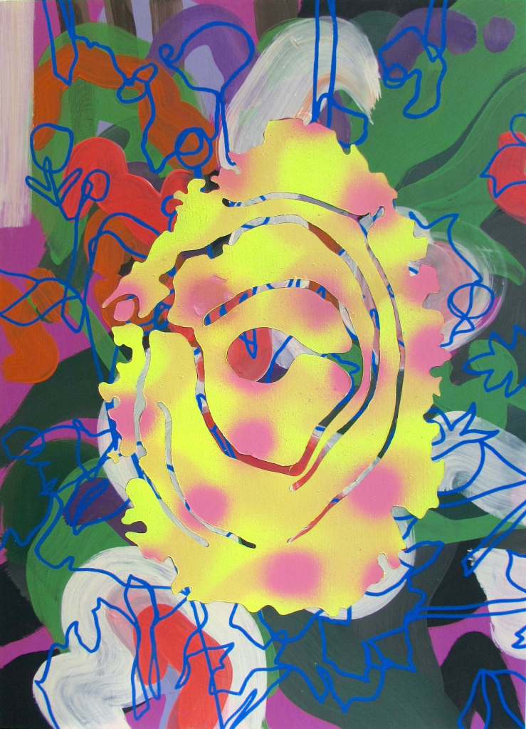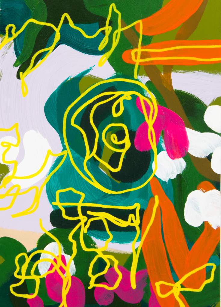 “The world depicted in Evie Banks’s neon-hued paintings engages all our modes of perception. It’s easy to forget you’re looking at a two-dimensional plane, as alien greens, ultramarine, and blossom-pinks clash and bang. The viewer is taken into a vortex-like realm of hyper-perception, augmented by Banks’s unique visual language and use of a variety of materials. Inspired by the town of St Ives in Cornwall, she aims to translate the botanic and landscapes into evocative and vibrant scenes. Her unique process depends on a continual building up of layers, combining gestural brush strokes, graphic lines, and block colour, with disarming results. Drawing references from phenomenology and colour theory, each piece is a whittled concentration of pure energy.” – New Blood Art.