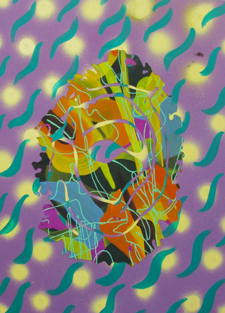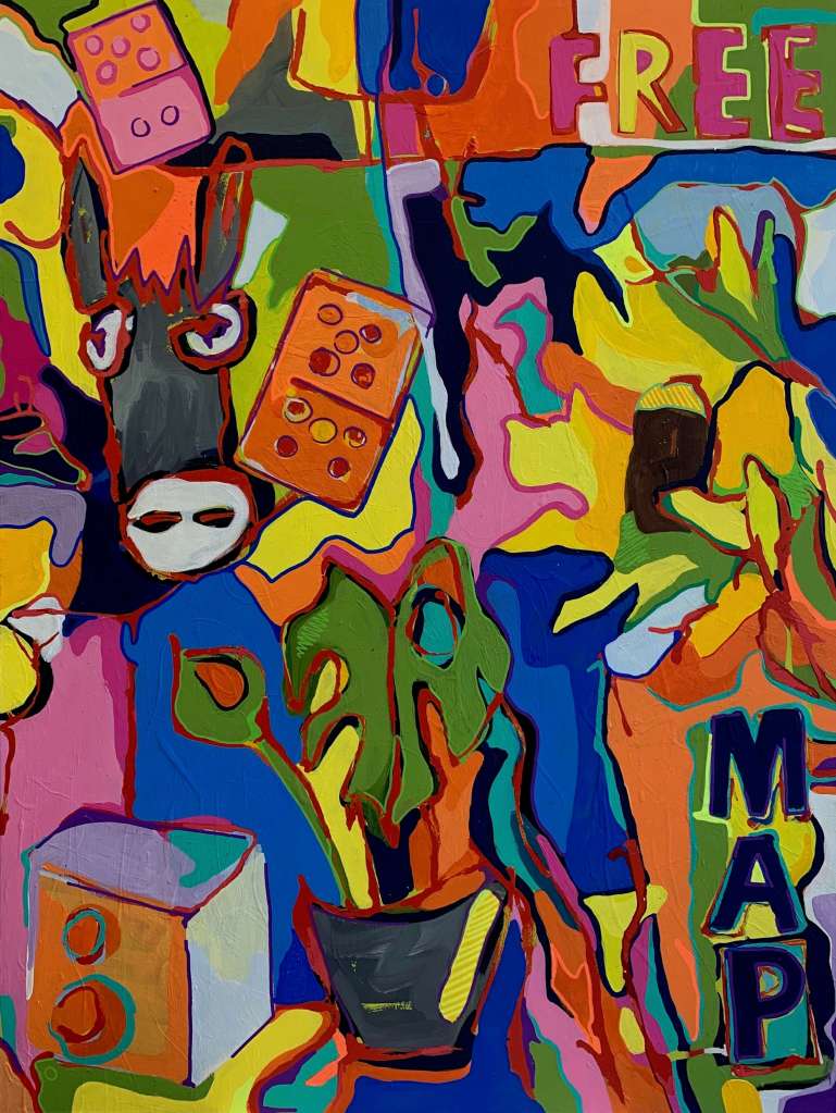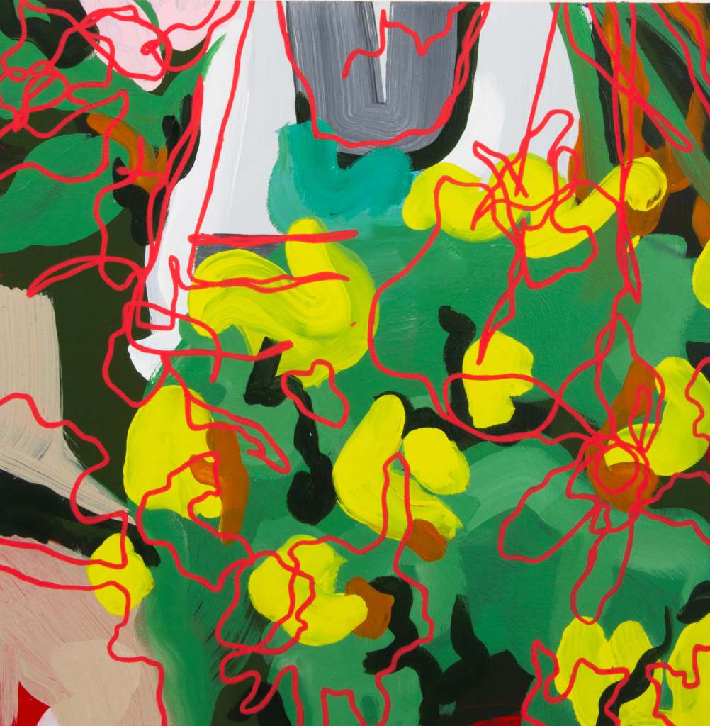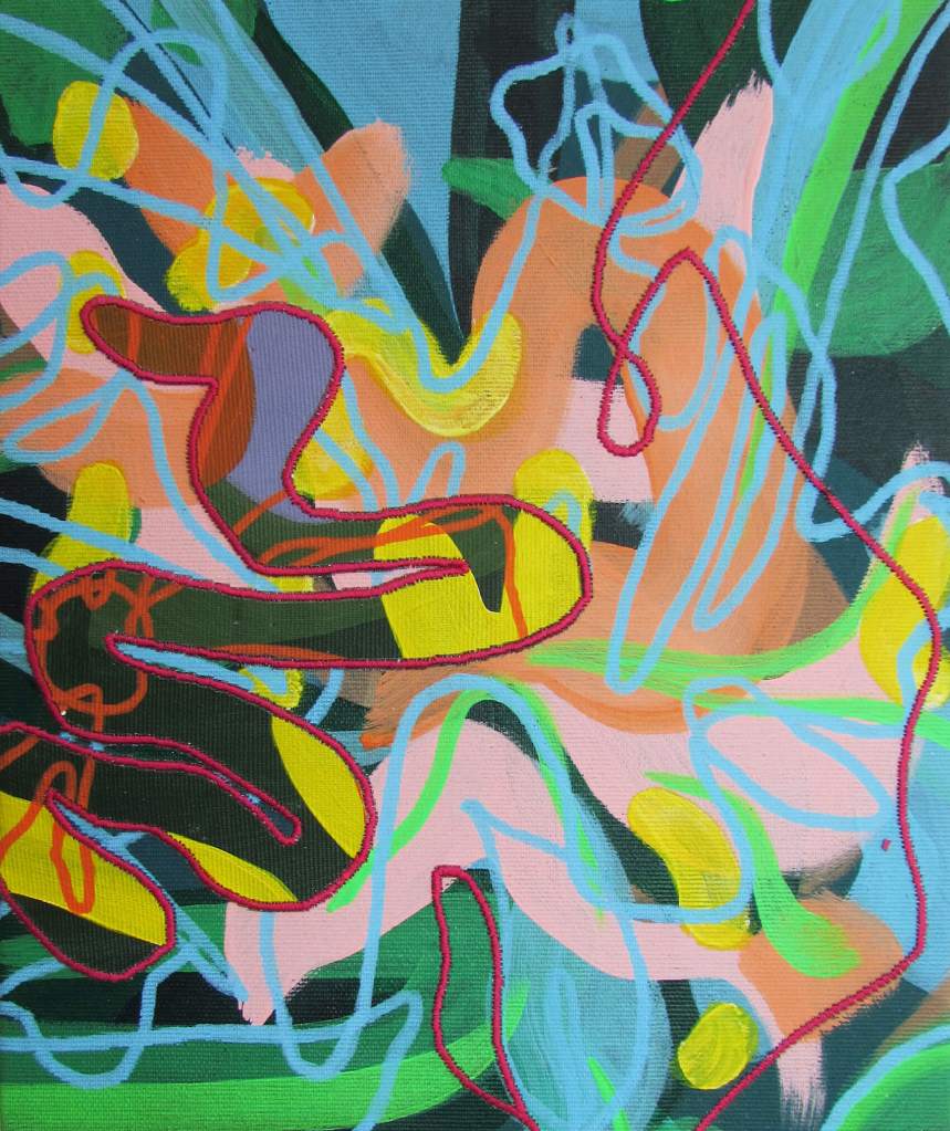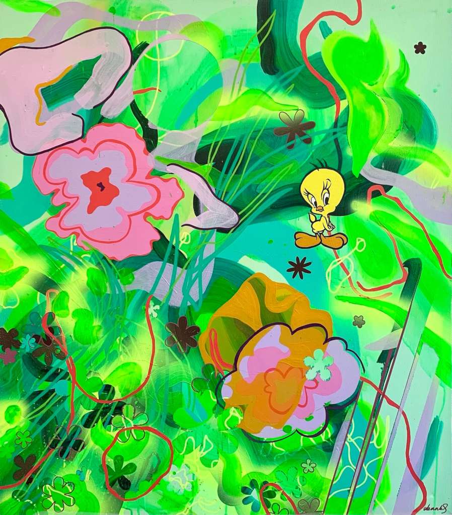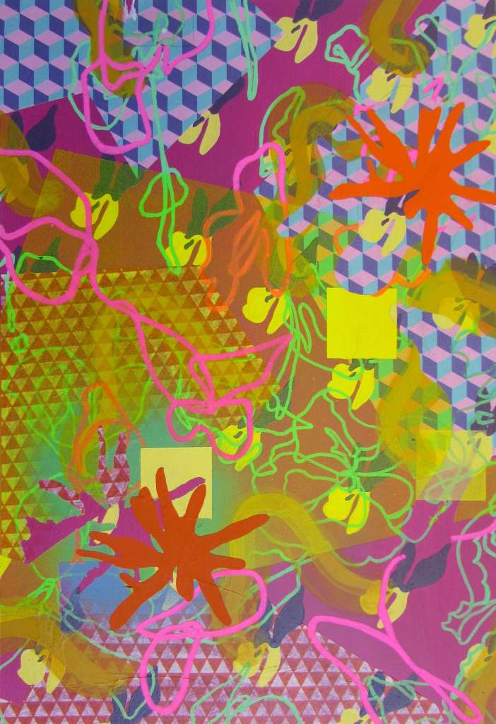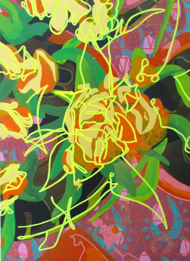 “The world depicted in Evie Banks’s neon-hued paintings engages all our modes of perception. It’s easy to forget you’re looking at a two-dimensional plane, as alien greens, ultramarine, and blossom-pinks clash and bang. The viewer is taken into a vortex-like realm of hyper-perception, augmented by Banks’s unique visual language and use of a variety of materials. Inspired by the town of St Ives in Cornwall, she aims to translate the botanic and landscapes into evocative and vibrant scenes. Her unique process depends on a continual building up of layers, combining gestural brush strokes, graphic lines, and block colour, with disarming results. Drawing references from phenomenology and colour theory, each piece is a whittled concentration of pure energy.” – New Blood Art.