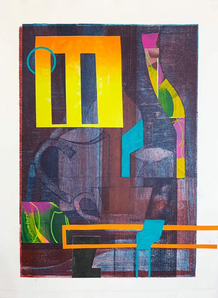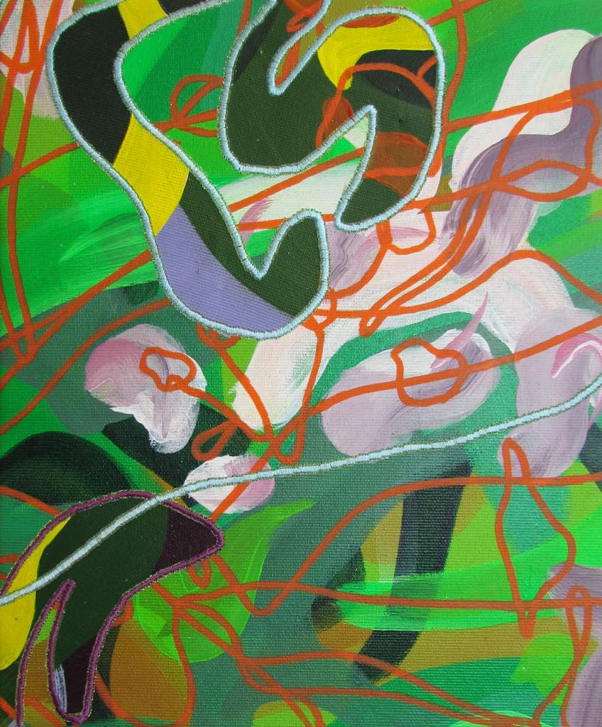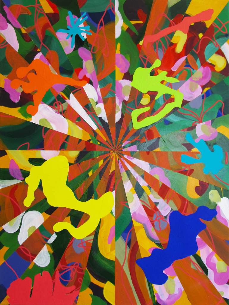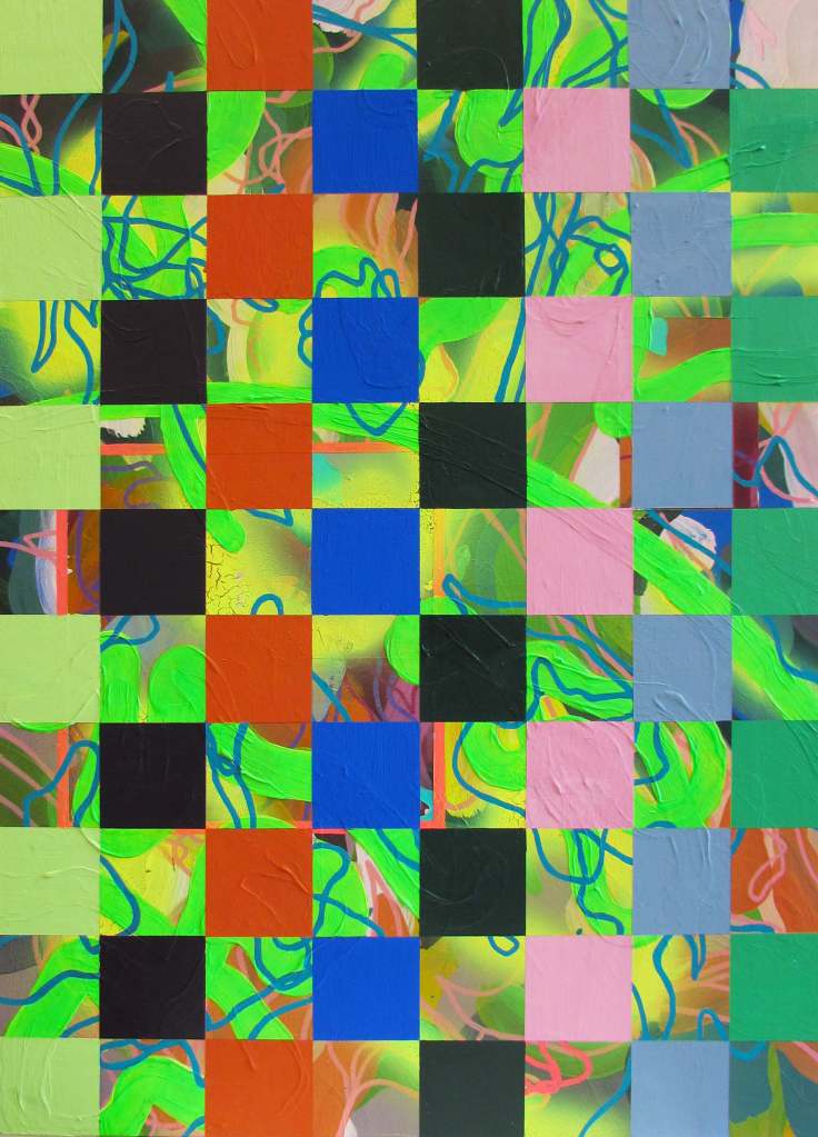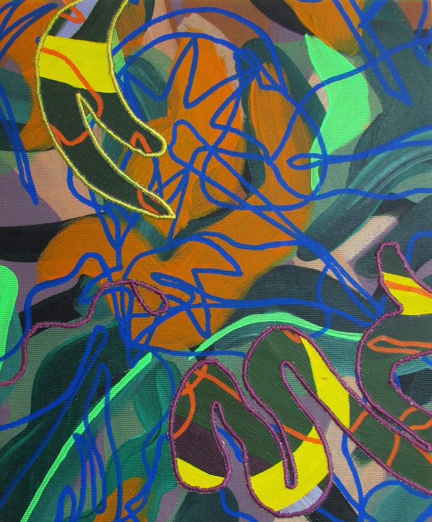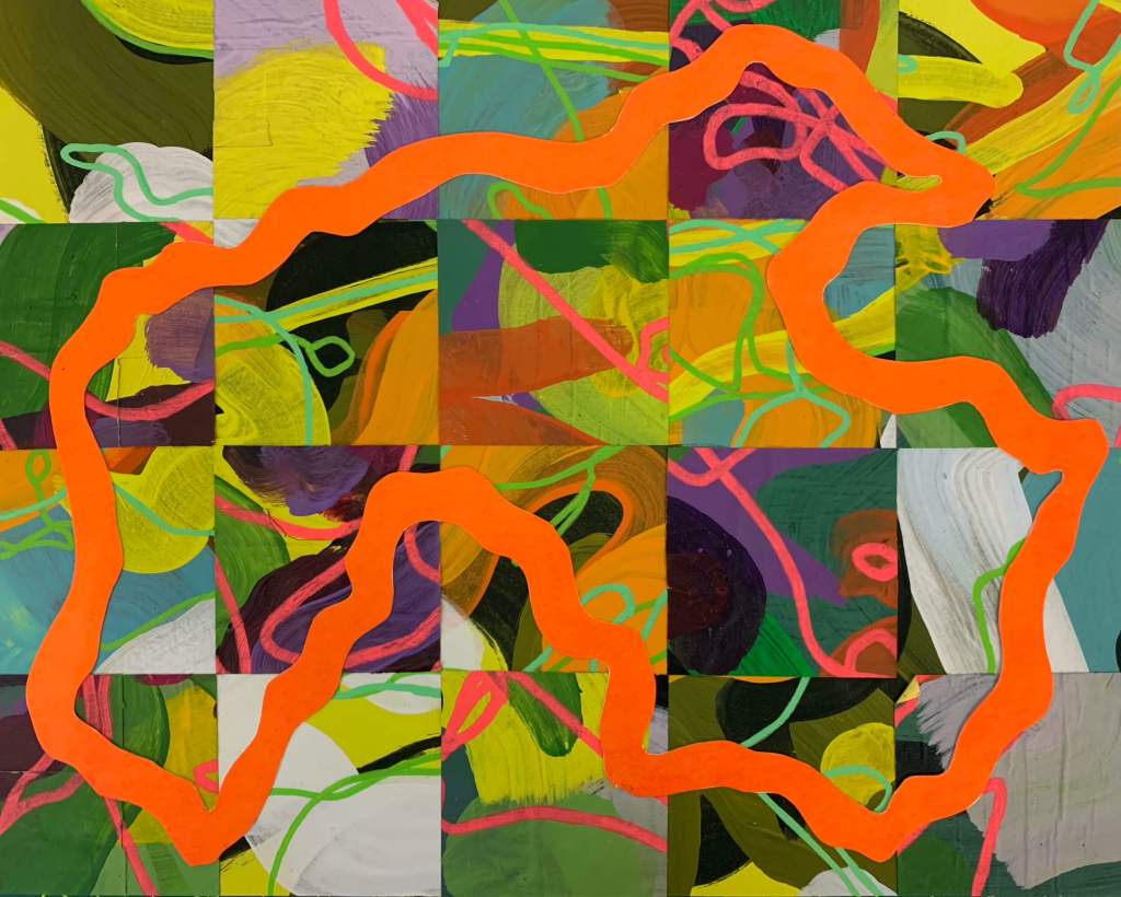 “The world depicted in Evie Banks’s neon-hued paintings engages all our modes of perception. It’s easy to forget you’re looking at a two-dimensional plane, as alien greens, ultramarine, and blossom-pinks clash and bang. The viewer is taken into a vortex-like realm of hyper-perception, augmented by Banks’s unique visual language and use of a variety of materials. Inspired by the town of St Ives in Cornwall, she aims to translate the botanic and landscapes into evocative and vibrant scenes. Her unique process depends on a continual building up of layers, combining gestural brush strokes, graphic lines, and block colour, with disarming results. Drawing references from phenomenology and colour theory, each piece is a whittled concentration of pure energy.” – New Blood Art.