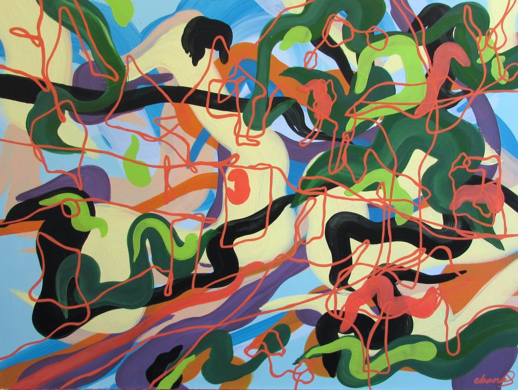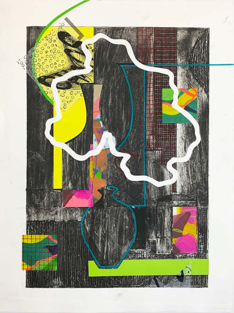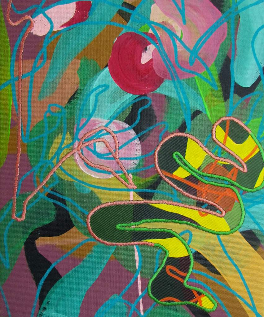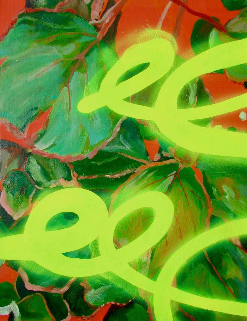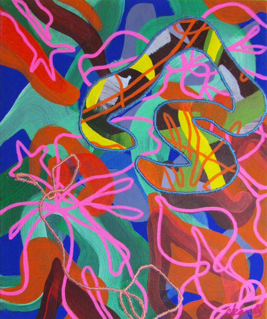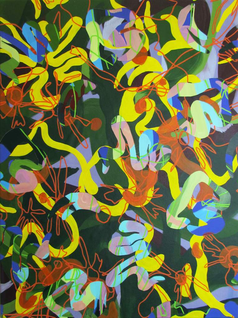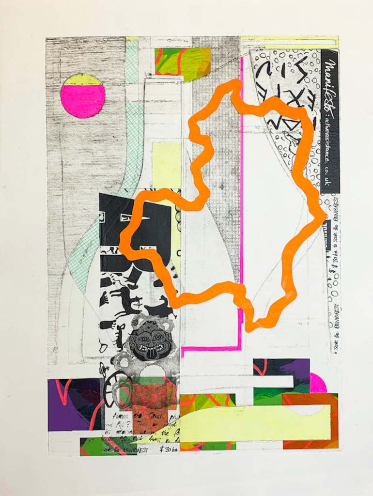 “The world depicted in Evie Banks’s neon-hued paintings engages all our modes of perception. It’s easy to forget you’re looking at a two-dimensional plane, as alien greens, ultramarine, and blossom-pinks clash and bang. The viewer is taken into a vortex-like realm of hyper-perception, augmented by Banks’s unique visual language and use of a variety of materials. Inspired by the town of St Ives in Cornwall, she aims to translate the botanic and landscapes into evocative and vibrant scenes. Her unique process depends on a continual building up of layers, combining gestural brush strokes, graphic lines, and block colour, with disarming results. Drawing references from phenomenology and colour theory, each piece is a whittled concentration of pure energy.” – New Blood Art.