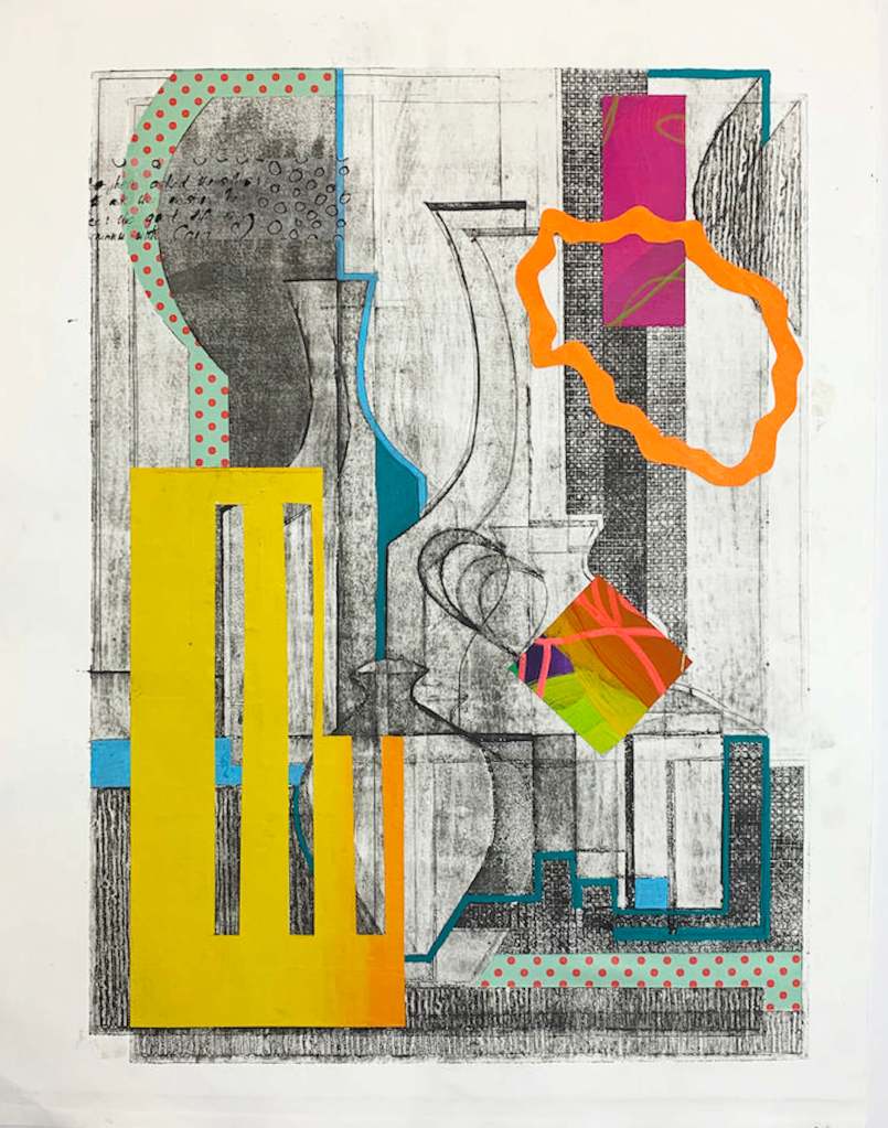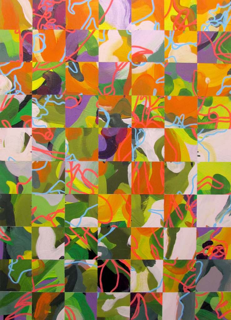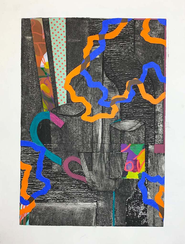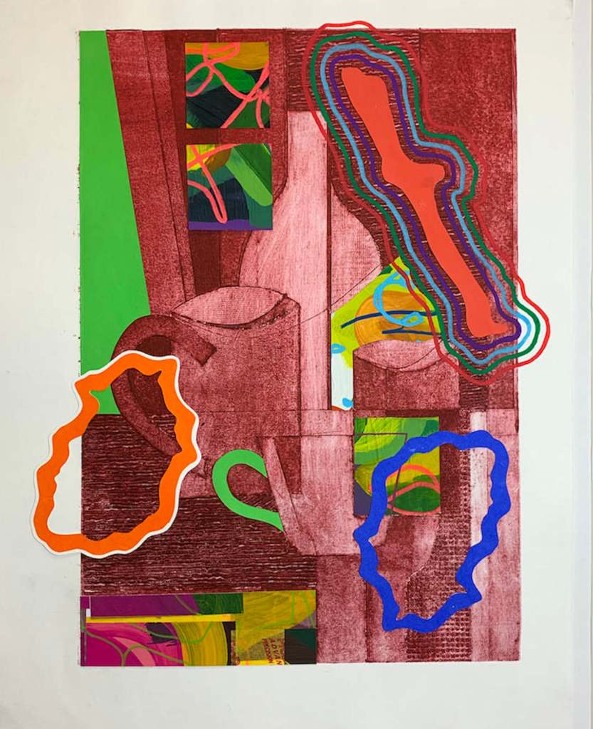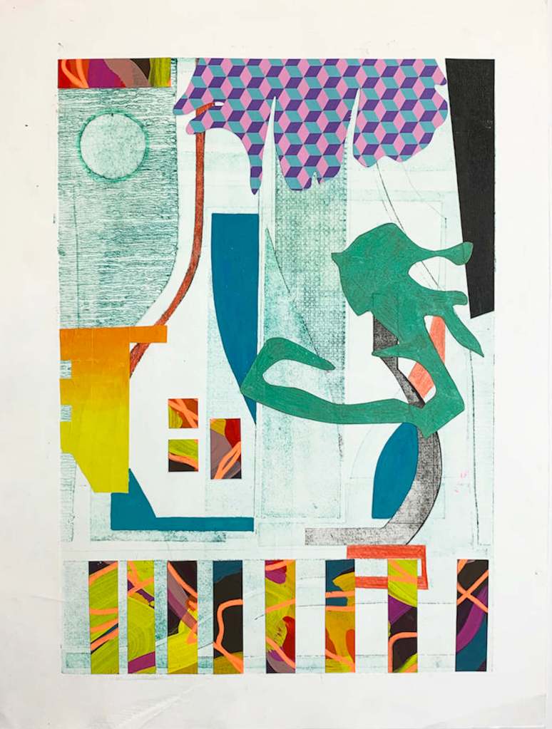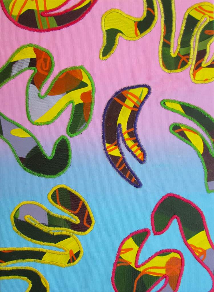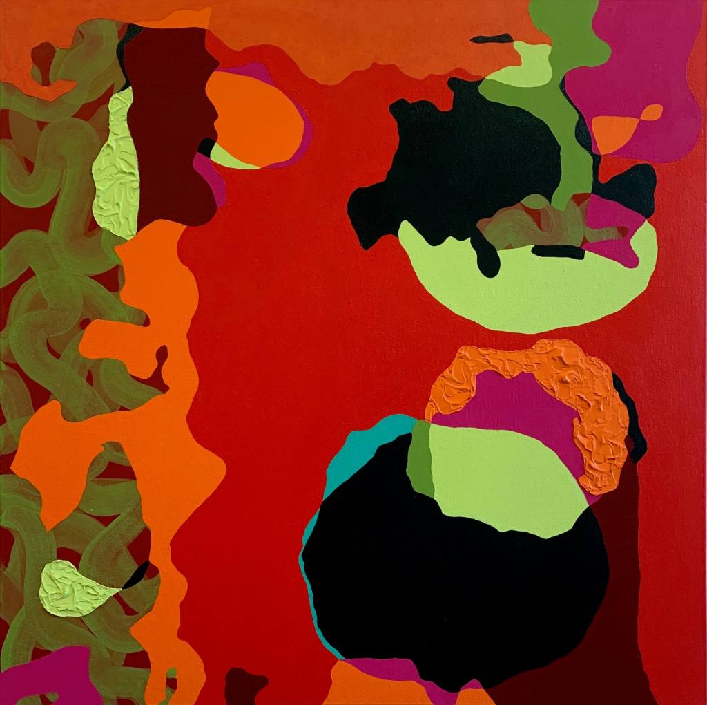 “The world depicted in Evie Banks’s neon-hued paintings engages all our modes of perception. It’s easy to forget you’re looking at a two-dimensional plane, as alien greens, ultramarine, and blossom-pinks clash and bang. The viewer is taken into a vortex-like realm of hyper-perception, augmented by Banks’s unique visual language and use of a variety of materials. Inspired by the town of St Ives in Cornwall, she aims to translate the botanic and landscapes into evocative and vibrant scenes. Her unique process depends on a continual building up of layers, combining gestural brush strokes, graphic lines, and block colour, with disarming results. Drawing references from phenomenology and colour theory, each piece is a whittled concentration of pure energy.” – New Blood Art.